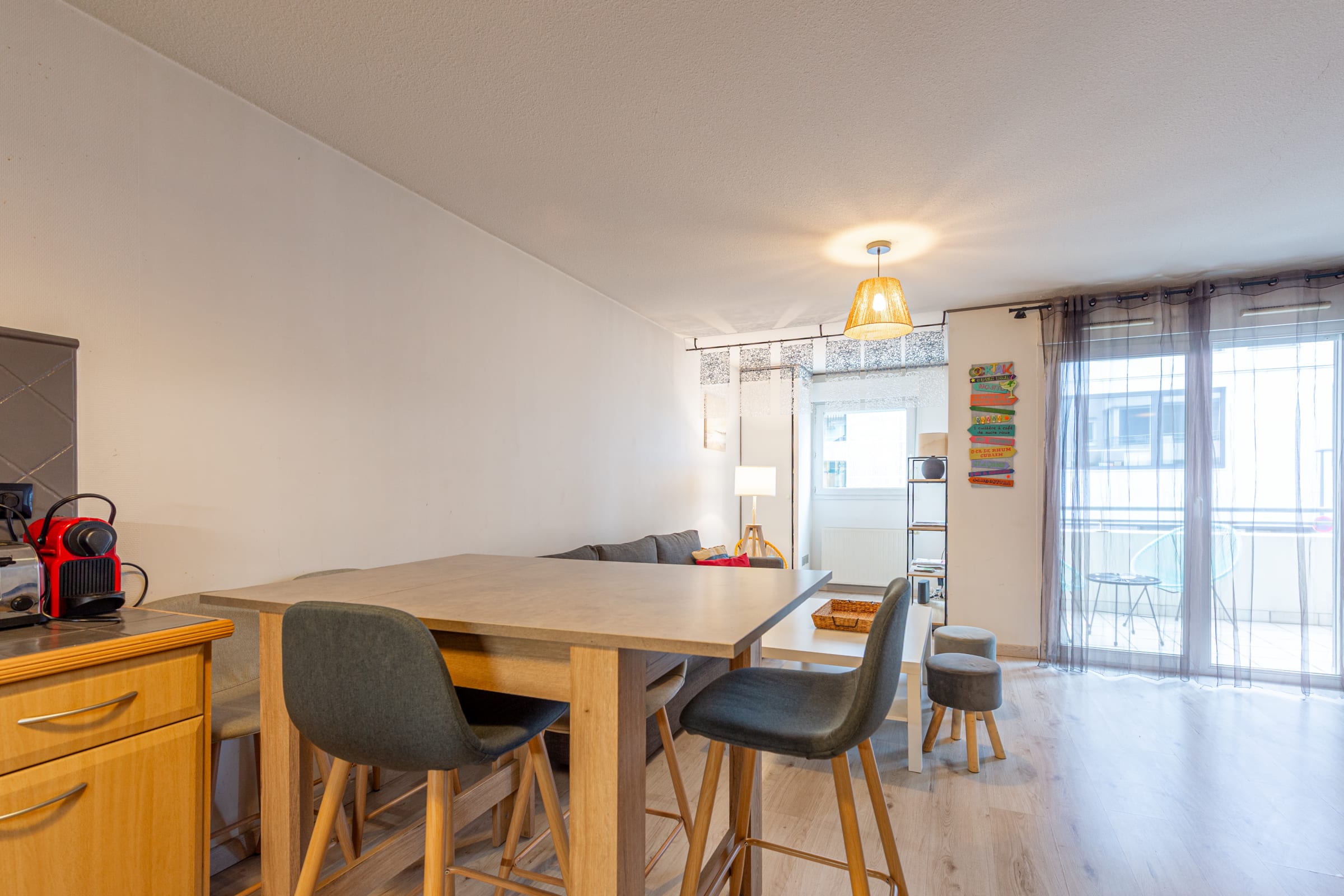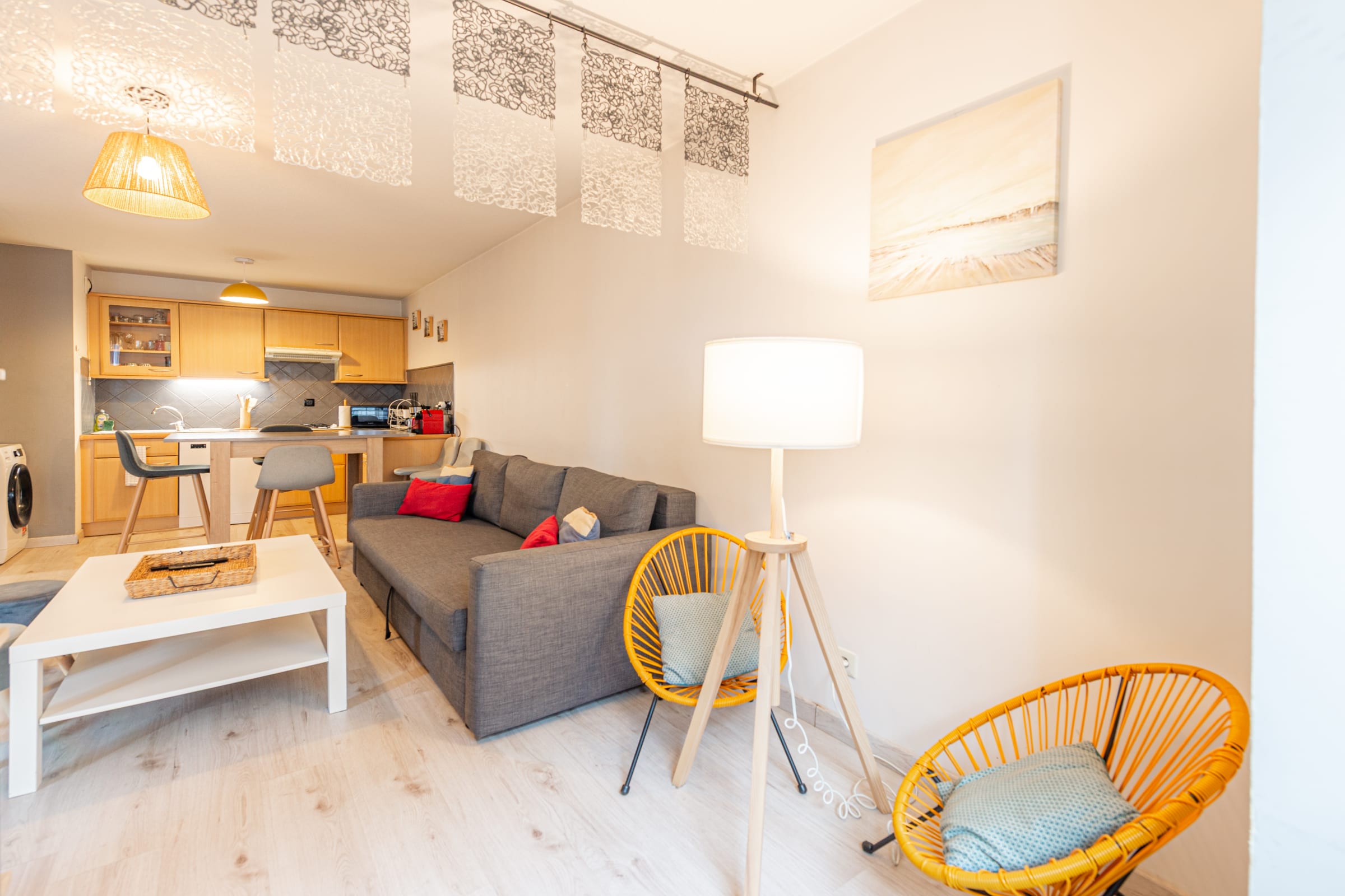 Une cuisine moderne ouverte sur le salon séjour avec terrasse et canapé lit