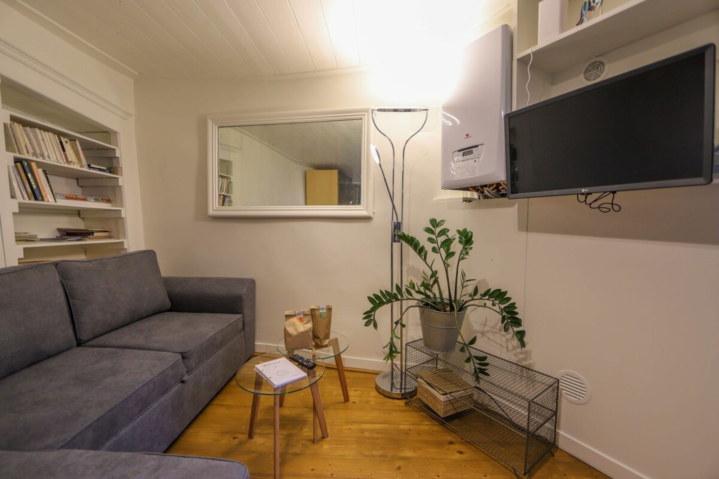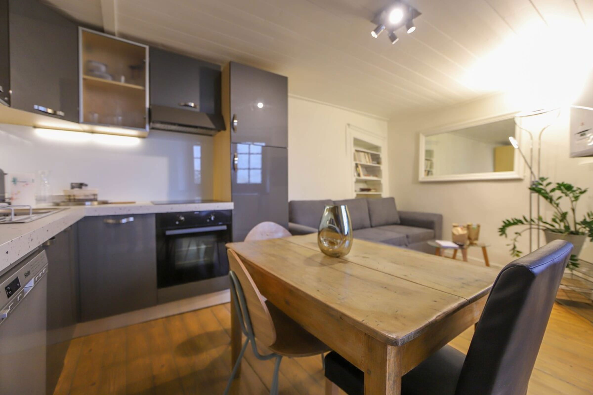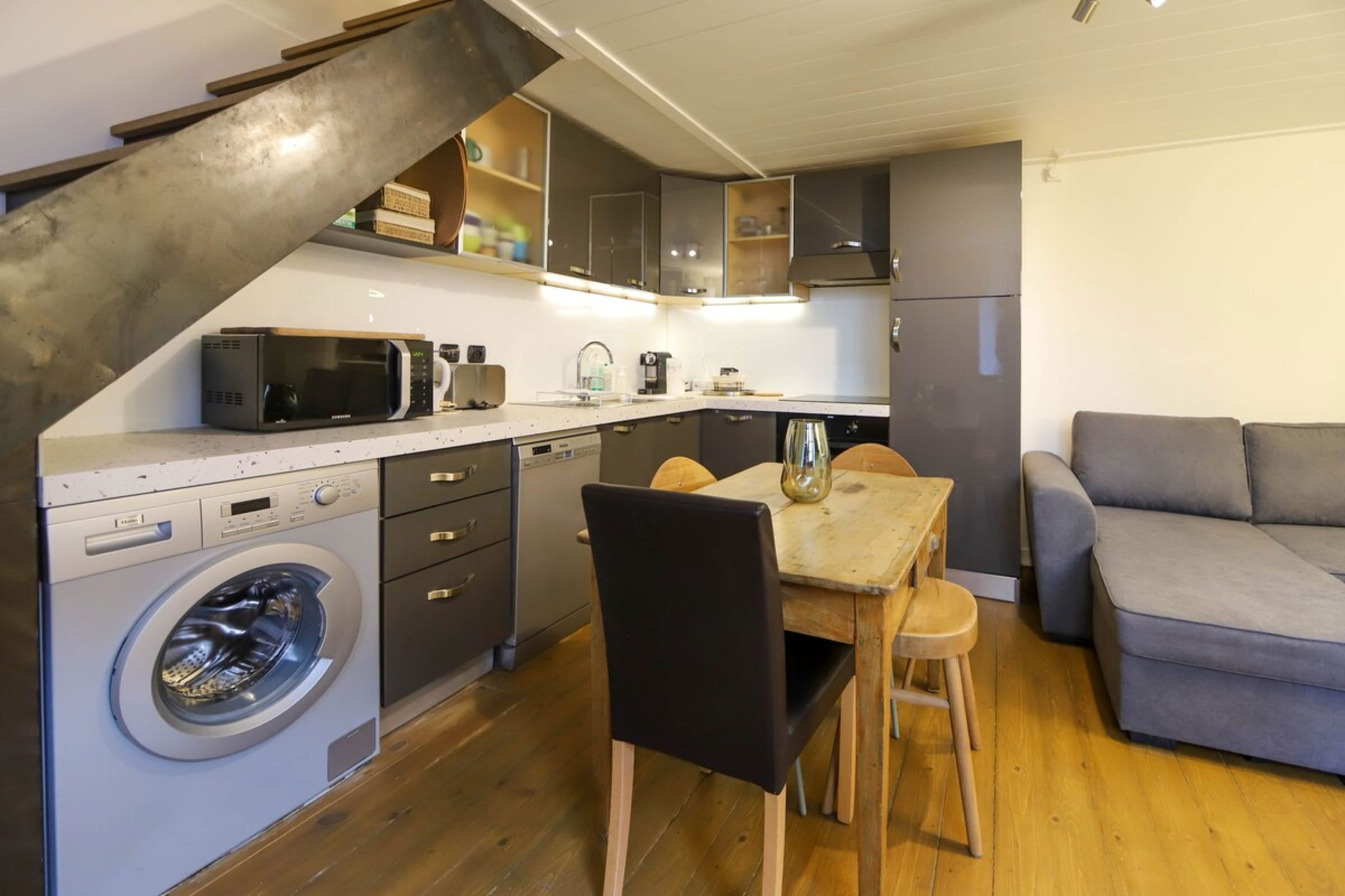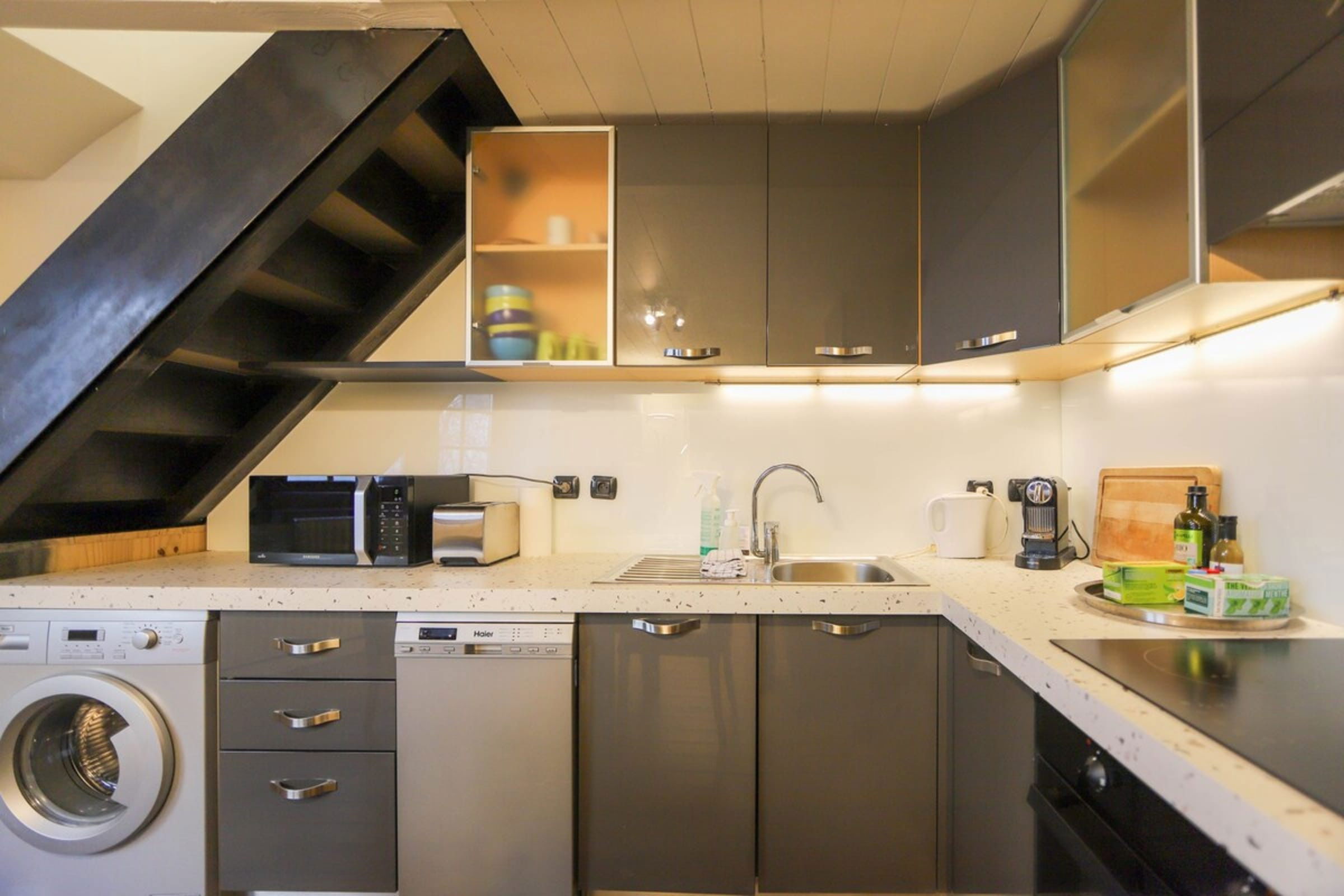 On the ground floor: fully equipped kitchen, lounge bench and TV.